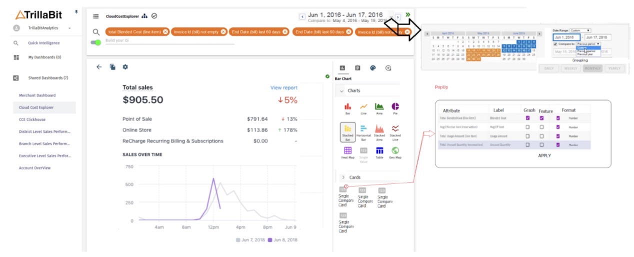 The TrillaBit platform is a hosted, highly dynamic, meta-data engine that points to client data stores and automatically generates queries based on configuring tokens in search (AKA Search-driven analytics). The platform creates smart visualizations then allows users to refine the results. This ease of use and exploration allows end users to quickly dive into the data and create their own dashboards to derive further insights instantly. All without the need to rely on developers.
