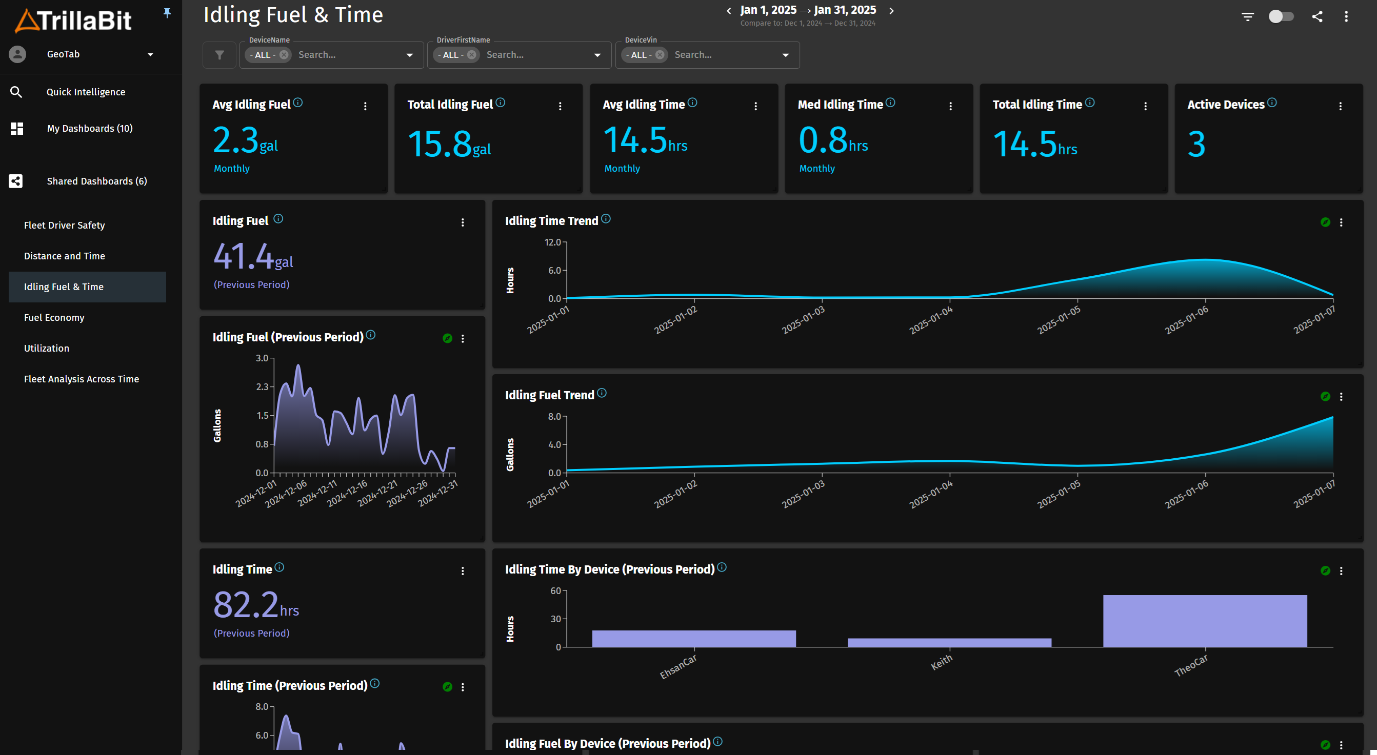 The Idling Dashboard allows you to see your Fleet behavour with idling across time and down to the driver or trip.